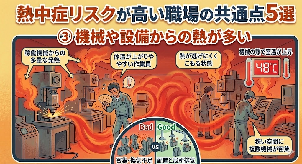 狭い空間で複数の機械が動くと、熱が逃げにくくなり、作業員の体温が上がりやすくなります。